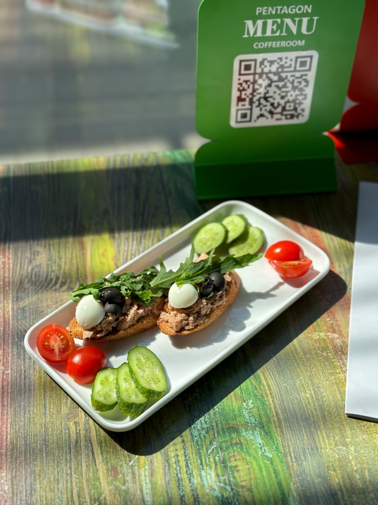 Брускета з тунцем – це вишукана закуска, яка поєднує свіжість інгредієнтів з ніжним смаком тунця. На хрусткій грінці розташовується сочний шматочок тунця, доповнений свіжим огірком і соковитим помідором Чері. Вершкове масло додає кремової текстури, а варене яйце приносить додаткову ситність і багатство смаку. Ця брускета стане чудовим вибором для стильного аперитиву або легкого обіду, радує своїм збалансованим смаковим поєднанням.