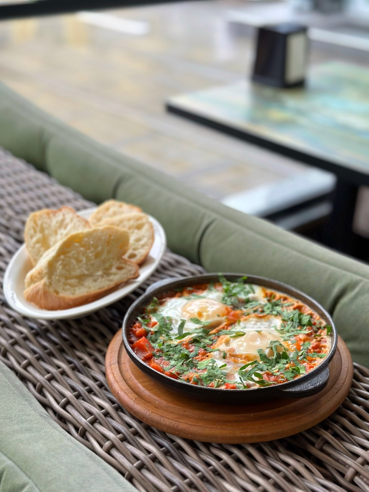 Шакшука – це смачна та поживна страва, що відображає традиції середземноморської кухні. На гарячій пательні обсмажуються стиглі помідори та солодкий перець, створюючи насичену основу. Додаються два яйця, які готуються до ідеальної консистенції, а свіжу зелень посипають для аромату та кольору. Подається шакшука з хрусткими хлібними тостами, які ідеально вбирають смачні соки. Ідеальний вибір для ситного сніданку або легкої вечері, даруючи відчуття тепла та задоволення.