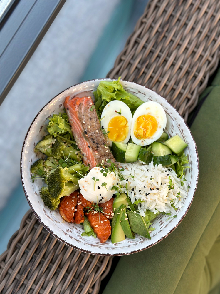Боул з телятиною – це вишукана страва, що ідеально поєднує ніжний смак і користь. Соковита телятина гармонійно доповнюється кіноа та міксом свіжого салату. Печений перець, морква, помідори черрі та спаржева квасоля додають яскравих відтінків і текстури. Кремовий сир «Філадельфія», стигле авокадо та варене яйце створюють насичений смаковий баланс, а кунжутний соус і мікрогрін завершують цю гастрономічну композицію. Ідеальний вибір для поживного обіду.