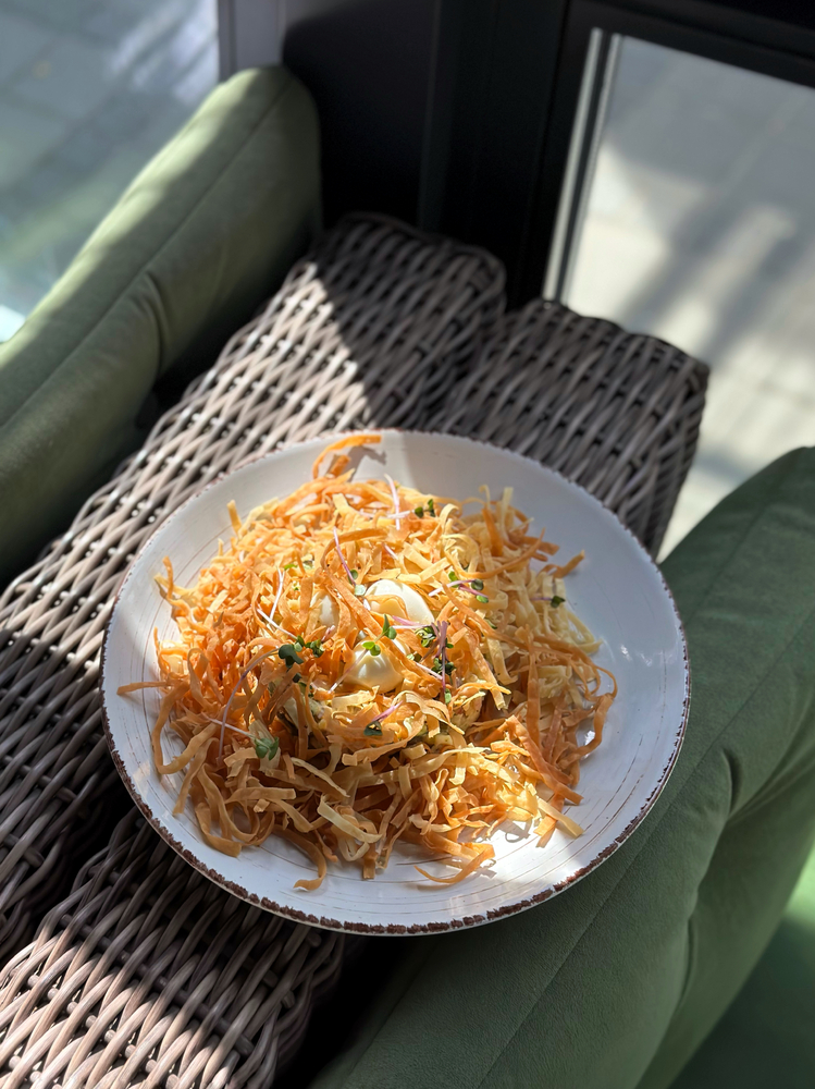 Салат «Гніздо» — це смачно та оригінально, салат який вражає своїм неповторним поєднанням інгредієнтів. В основі страви — балик вищого сорту, який надає салату глибокий смак і аромат. Свіжий огірок додає легкості та хрусткої текстури, а твердий сир збагачує страву насиченістю та кремовістю. Яйце куряче та перепелине забезпечують додаткову ніжність і пишність. Лаваш виступає як основа, обгортаючи всі інгредієнти в ідеальний поєднаний смак. Майонез і гірчиця доповнюють салат особливими нотками та надають йому виразного смаку, створюючи неперевершену гармонію. Цей салат стане чудовим вибором для любителів смачних і ситних страв, які цінують оригінальність і якість.