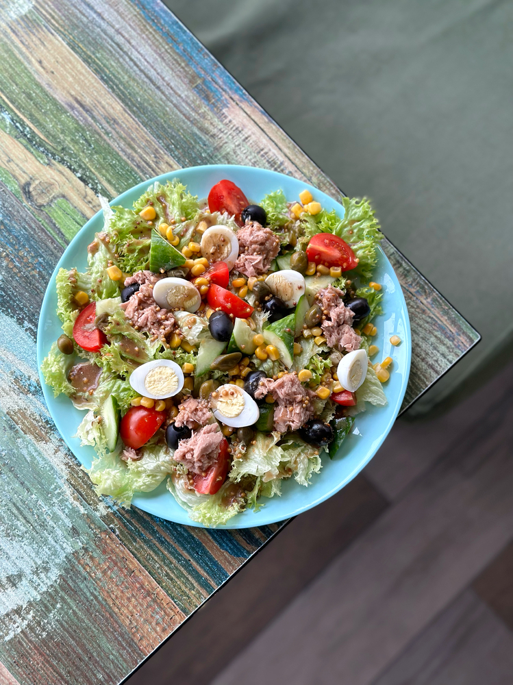 Салат з тунцем — це легка та смачна комбінація свіжих інгредієнтів, яка подарує задоволення кожному. Тунець у поєднанні з хрустким листям салату, ароматними помідорами чері та огірками створює освіжаючу основу. Кукурудза, маслини та перепелині яйця додають текстуру та різноманіття смаків. Каперси, французька гірчиця, соєвий соус і оливкова олія надають страві пікантних ноток, а часник і винний оцет доповнюють її неповторний аромат. Ідеальний варіант для тих, хто любить легкі, але смачні страви.
